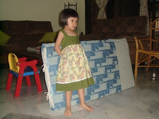 Aunty Shannon bought me a lovely green dress for my coming 3rd birthday. The dress fits me perfectly and I like it very much. The flowers on the dress is lovely and I also like the ribbon behind the dress. Thank you very much Aunty Shannon. You are so kind and thoughtful. I want to wear it every day after I have my bath but mommy said I can only wear it when we go *gai gai*. I just can’t wait to go out and wear my nice little dress again.