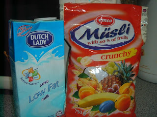 After seeing how healthy Shireen (Healthfreakmommy.com) eats everyday, I wanted to eat like her too. Well, of course, I don’t think I can follow her exact diet but I want to stop eating noodles for breakfast every day. Instead I opt to eat something light. So, I bought some mixed fruits and nuts cereal and low fat milk yesterday 😉